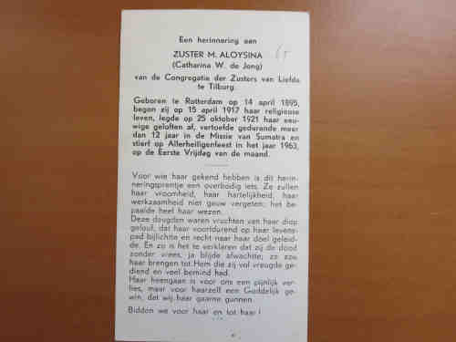 • Van 9-11-1912 tot 28-8-1916 heeft zij op de Jericholaan 2 ten hoogte van Rijnsoever gewoond. Daarna is zij vertrokken naar Den Haag, Bibbetsestraat 42 B. • Catharina Wilhelmina de Jong [65] had in 1915 te Rotterdam als beroep: winkeljuffrouw 18 • Catharina was rooms katholiek 18 • Catharina Wilhelmina de Jong [65] had als beroep: non in de missie van Sumatra |