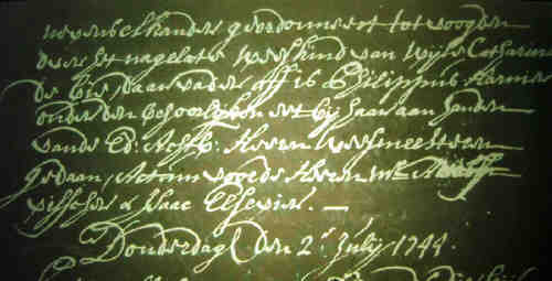 • Op 14-02-1740 worden Gerrits Arisz de Jong en Philipus Harniers voogden over de kinderen van wijle Jacob de Vos, zijnde haar overleden man • In de boeken van de weeskamer op 2-7-1744 worden Adrianus de Bie en Gerrit de Jong geordonneerd als voogdij bij het overlijden van Catharia de Bie. • Jan de With, Ariaantje de Jong, Jannitje de Jong, Metje Houwaart, Elisabeth de Zwart, Lena van der Maas, Jannetje Stroopers, Evert Moret, Jannetje van der Maas, Johanna Groothuijzen, Andries van der Zijde, Willemijn Houthuijze, Zwaantje de Waart, Adrianus de Bie, Ariaantje de Waart. waren getuigen bij de doop van de kinderen in 1745-1763 te Rotterdam 47 • In 1740-1741 woonde Phillipius aan Hofstraat te Rotterdam 47 • In 1745-1748 woonde Phillipius aan Breestraat te Rotterdam 47 • In 1748 woonde Phillipius aan Gouzewegt te Rotterdam 47 • In 1750-1752 woonde Phillipius aan Breestraat te Rotterdam 47 • In 1755 woonde Phillipius aan Agtert 't klooster te Rotterdam 47 • In 1756-1759 woonde Phillipius aan Pannekoekstraat te Rotterdam 47 • In 1795 woonde Phillipius aan L. pankoekstraat vooraan te Rotterdam 114 • Bij het overlijden in 1795 waren er nog 4 meerderjarige kinderen in leven. Phillipius trouwde Kaatje de Bie op 17 November 1739 in Rotterdam.113 (Kaatje de Bie overleed in 1744 in Rotterdam 117.) Phillipius trouwde vervolgens met Elisabeth De With, dochter van Jan de With en Cornelia Paulus Tieloter, op 21 Juli 1744 in Rotterdam. (Elisabeth De With werd geboren op 5 Juni 1721 in Rotterdam 118 en overleed op 21 Oktober 1800 in Rotterdam 119.) |