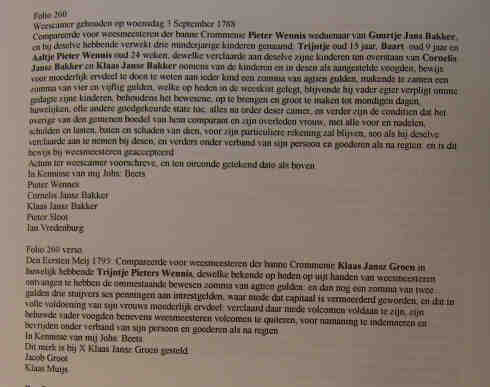 • Notarisakten/Staatboeken: 34 Folio 260. Weescamer gehouden op woensdag 3 September 1788 Compareerde voor weesmeesteren der banne Crommenie Pieter Wennis weduenaar van Guurtje Jans Bakker, en bij deselve hebbende verwekt drie minderjarige kinderen genaamd: Trijntje oud 15 jaar, Baart oud 9 jaar en Aaltje Pieter Wennis oud 24 weken, dewelke verclaarde aan deselve zijne kinderen ten overstaan van Cornelis Jansz Bakker en Klaas Jansz Bakker oomens van de kinderen en in desen als aangestelde voogden, bewijs voor moederlijk ervdeel te doen te weten aan ieder kind een zomma van agtien gulden, makende te zamen een zomma van vier en vijftig gulden, welke op heden in de weeskist gelegt, blijvende hij vader egter verpligt omme gedagte zijne kinderen, behoudens het bewesene, op te brengen en groot te maken tot mondigen dagen, huwelijken, ofte andere goedgekeurde state toe, alles na order deser camer, en verder zijn de conditien dat het overige van den gemenen boedel van hem comparant en zijn overleden vrouw, met alle voor en nadelen, schulden en lasten, baten en schaden van dien, voor zijn particuliere rekening zal blijven, soo als hij deselve verclaarde aan te nemen bij desen, en verders onder verband van sijn persoon en goederen als na regten: en is dit bewijs bij weesmeesteren geaccepteerd Actum ter weescamer voorschreve, en ten oirconde getekend dato als boven In Kennisse van mij Johs: Beets Pieter Wennes Cornelis Jansz Bakker Klaas Jansz Bakker Pieter Sloot Jan Vredenburg