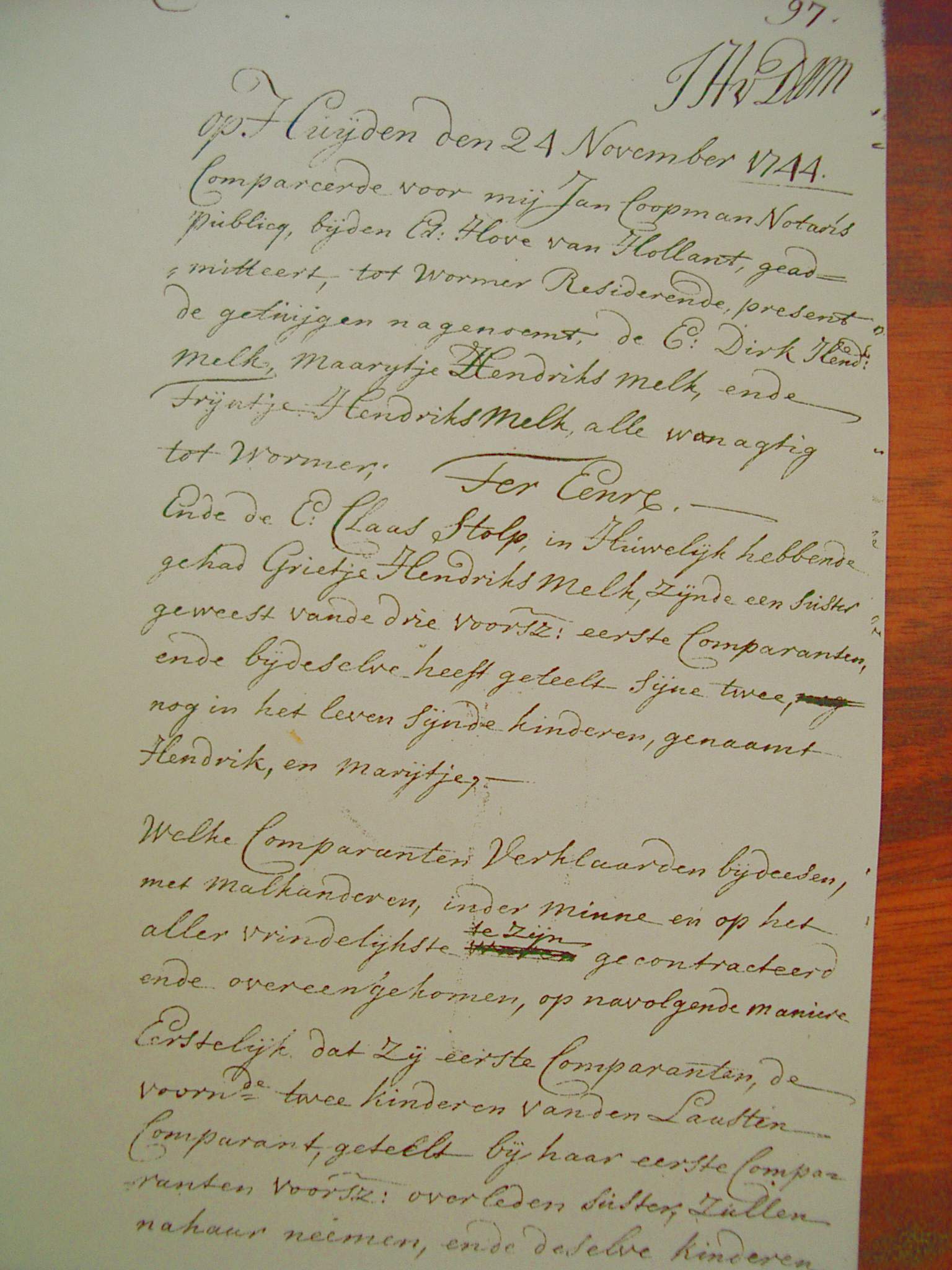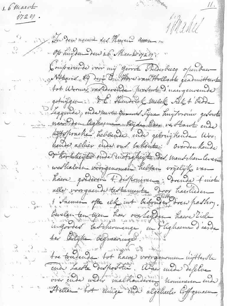 Notaris was Dick van Santen. Uit de akte blijkt dat maarten zijn naam kon schrijven. Dieuwertje tekende met een merk. Getuigen was Harmen Heertjes.