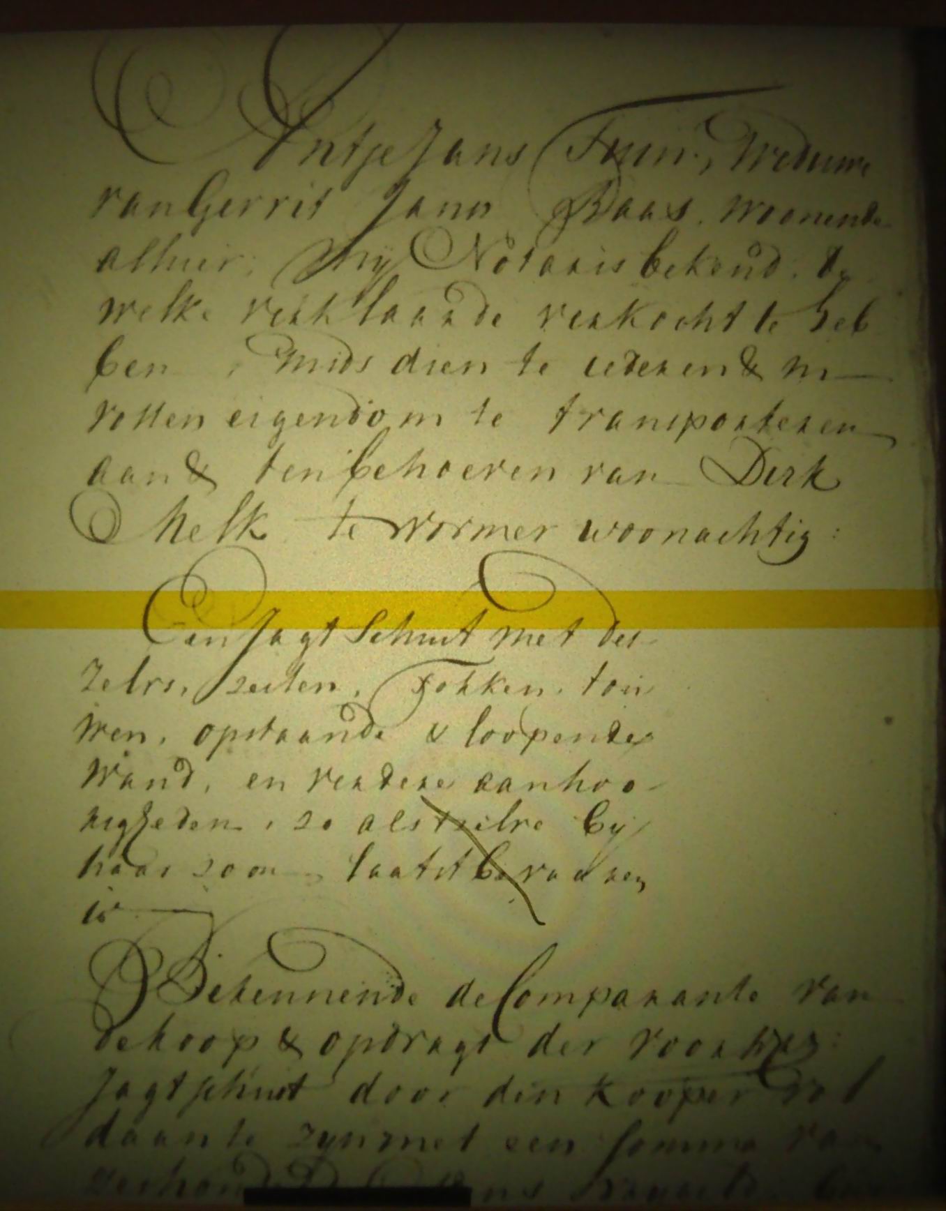 Voor Fredrick van der Meer notaris tot Wormer komen Woumen Baertz. ende Arent Arentsz. Stijnes en voor Dirck Jansz. Maertses is Dirck Jansz. Melck en Willem Jacobsz. Quack en sijn broeder Wilbert Quack, Claes, ende Floris Arentsz. al te samen schuijtvoerder alhier ende besoldigt verkoopers competen dese provintie van Hollandt ende Westvrieslandt.